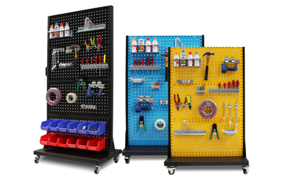 掛鉤與方孔掛板配合使用,可任意變換孔位,定位快捷,非常穩固,滿足各類工具的定置管理,節省找尋時間;背掛零件盒與百葉掛板配合使用,吊掛容易,配有色彩標簽,小型物料、零件可利用色彩管理分類儲存。